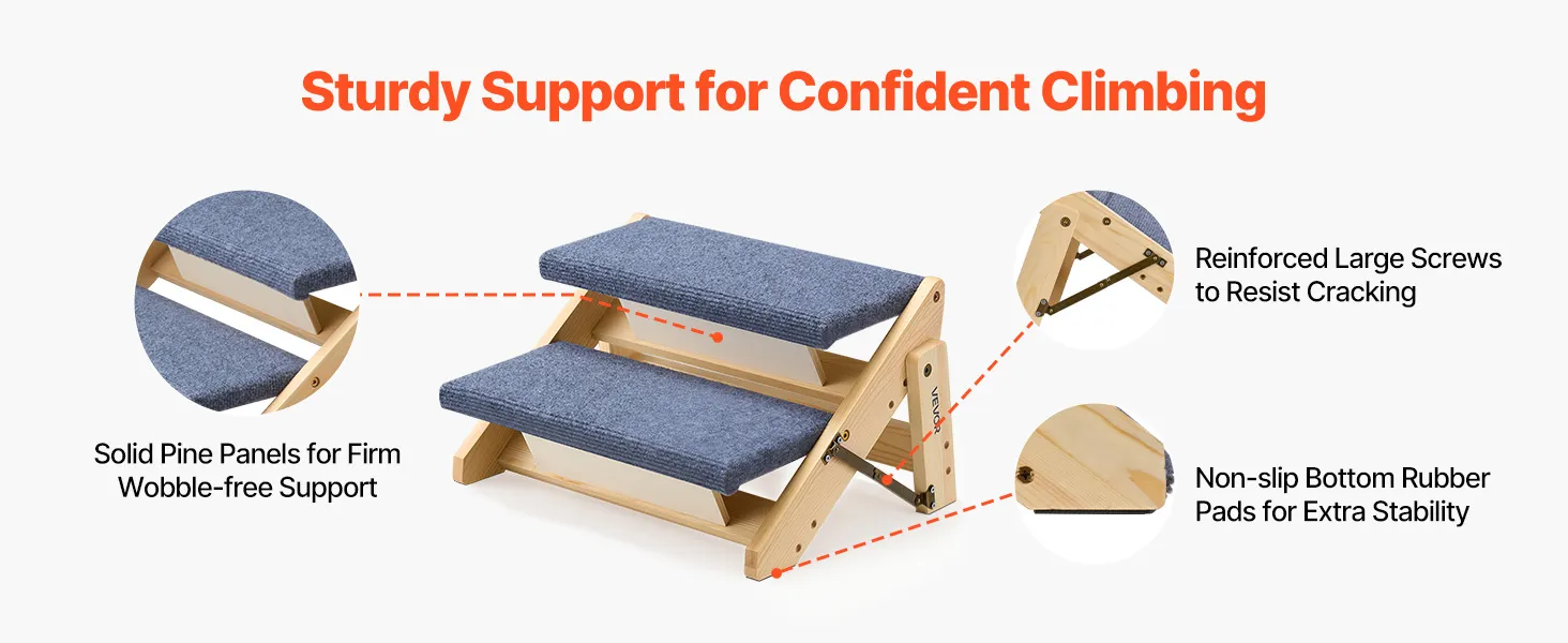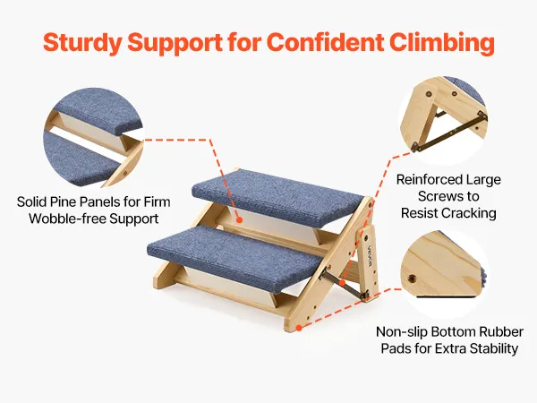Pine wood boards with large screws provide durable support and reduce wobbling so pets can climb with confidence.