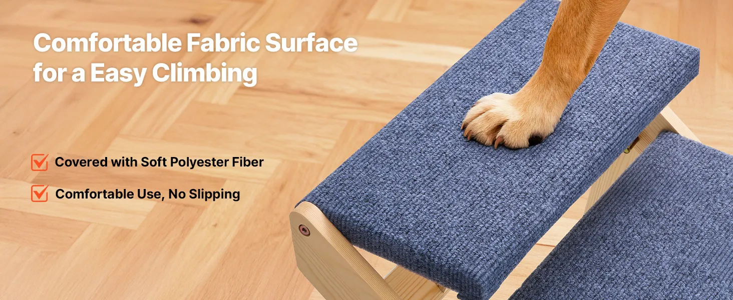 Comfortable, Non-Slip Surface: The dog stairs for bed feature a soft polyester fabric cover that provides excellent traction for paws. It helps pets walk securely, avoids slipping, and makes climbing easier for your pets