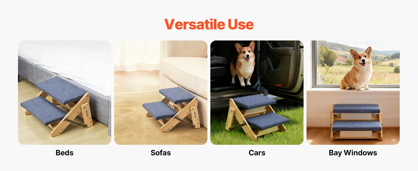 Sturdy and Secure Support: The dog stairs is built with a strong wooden frame that supports pets up to 110 lbs (50 kg). Large screws add stability, and non-slip rubber pads on the bottom avoid wobbling while helping pets climb securely