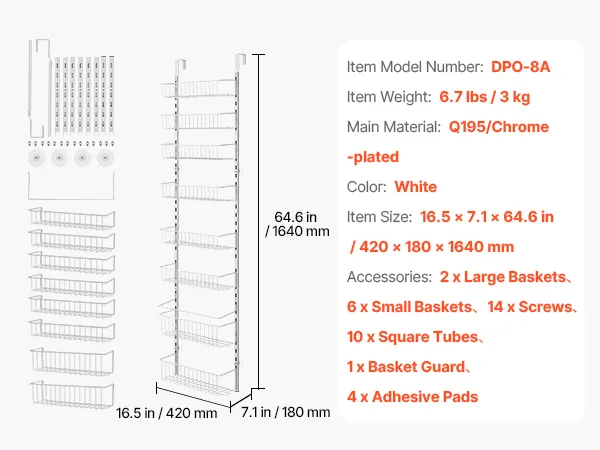 Fits Most Doors: This over the door pantry organizer is compatible with doors that have a panel thickness of no more than 2 in / 50 mm, and the door gap must be greater than 0.06 in / 1.5mm. There should also be at least 7.1 in / 180mm of clearance between the door and the pantry shelf. Please check your cabinet door dimensions to ensure a proper fit and smooth door closure