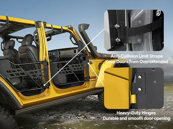 Easy Installation: Equipped with heavy-duty hinges, these jeep tube doors require no drilling or welding, allowing for a hassle-free installation onto factory door hinges. The included nylon limit straps avoid over-extension, lowering the risk of collisions.