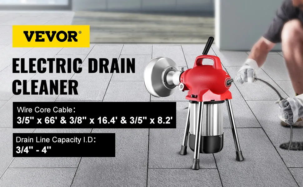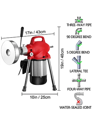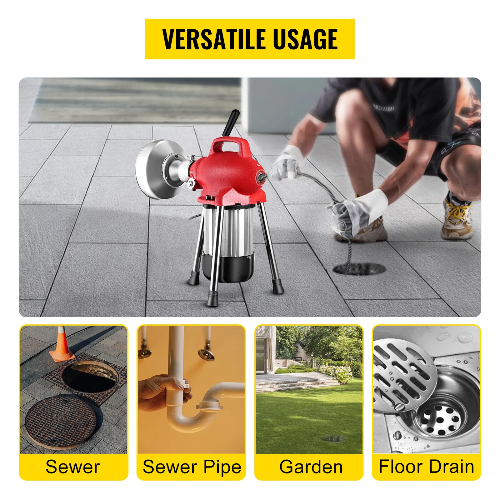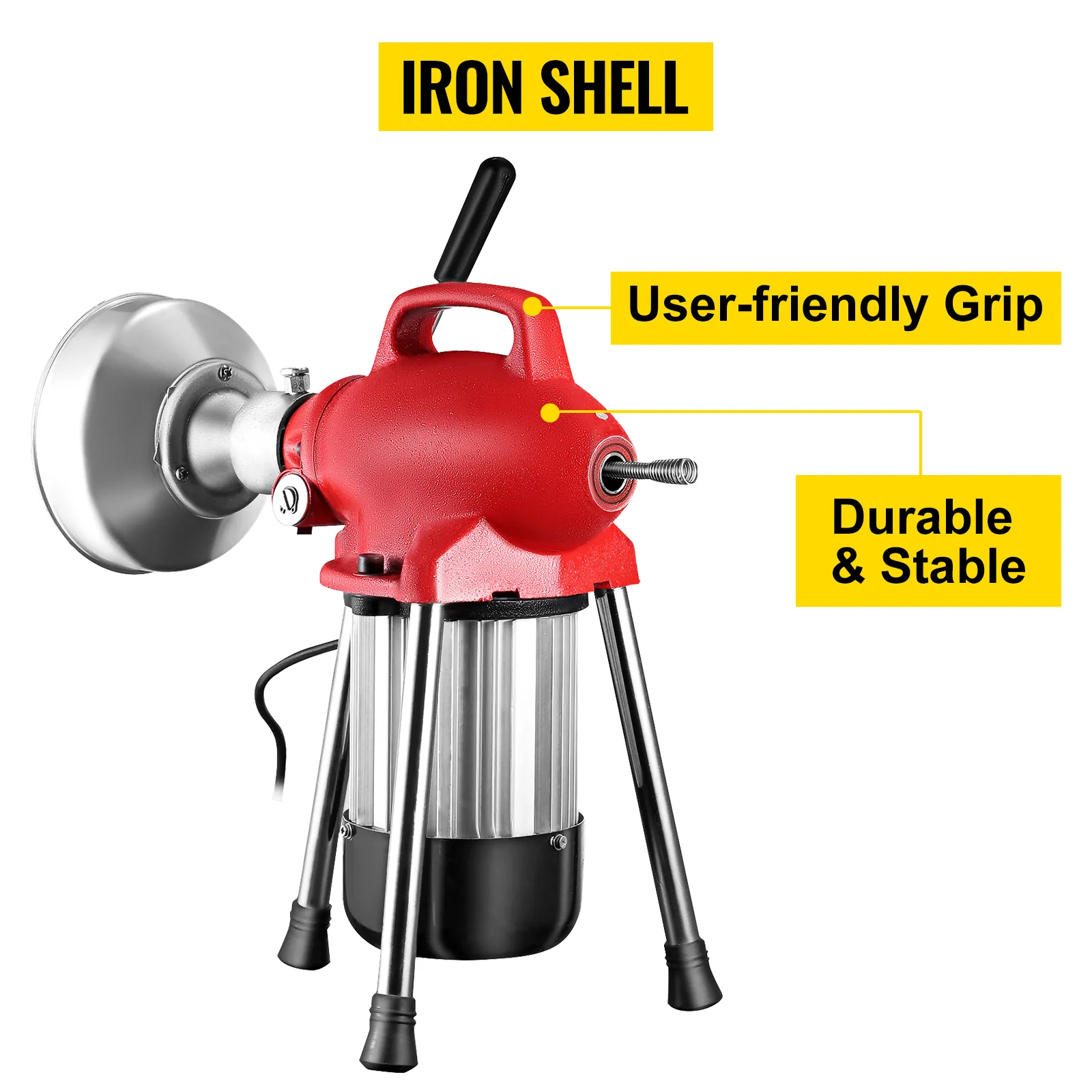 The versatile sewer cleaning machine is an easy-to-use drain machine with a portable design. It features a durable iron integrated body that maximizes its lifespan. Pull the handle down, and the cable can spin at 400rpm. Ideal for the sink, shower, and floor drains.