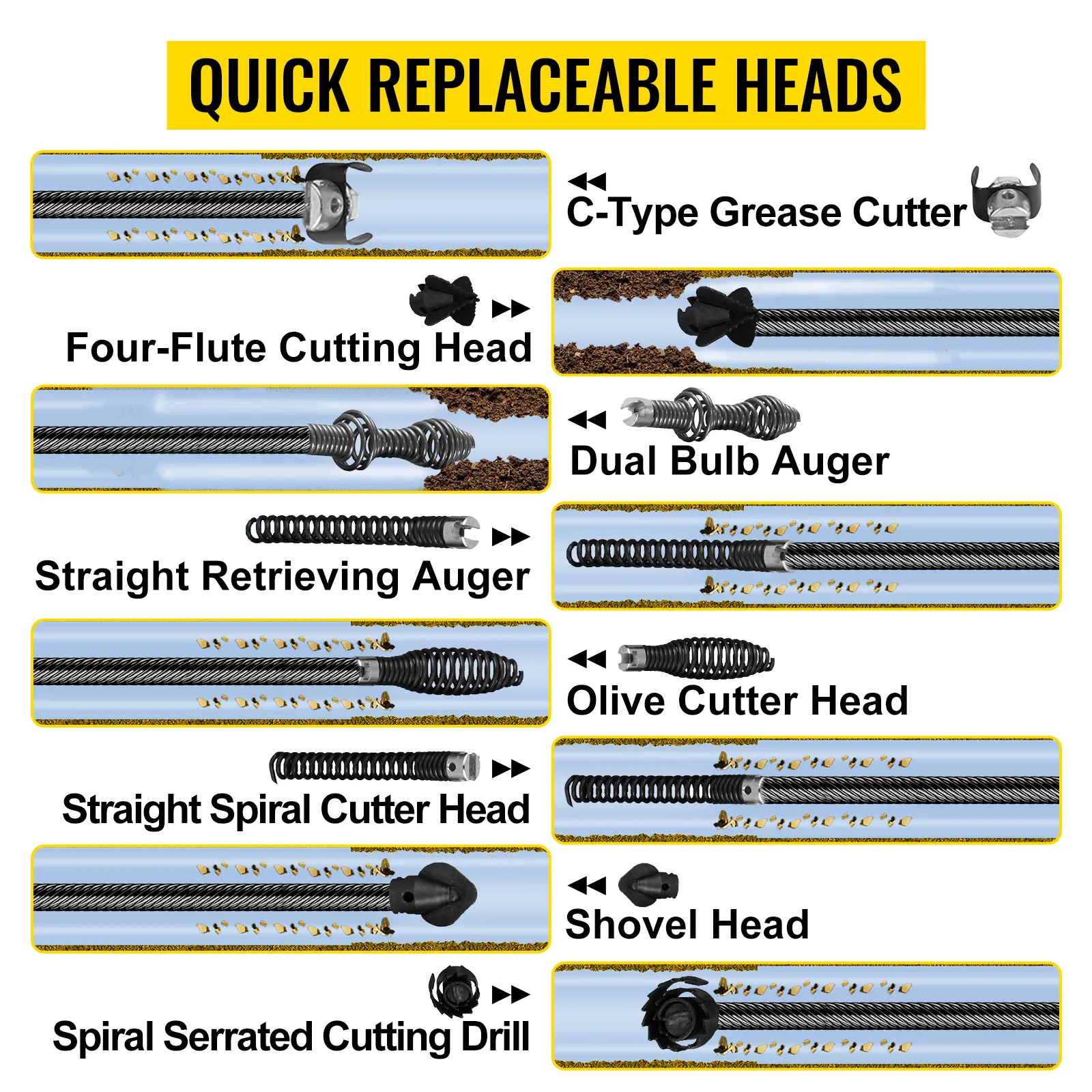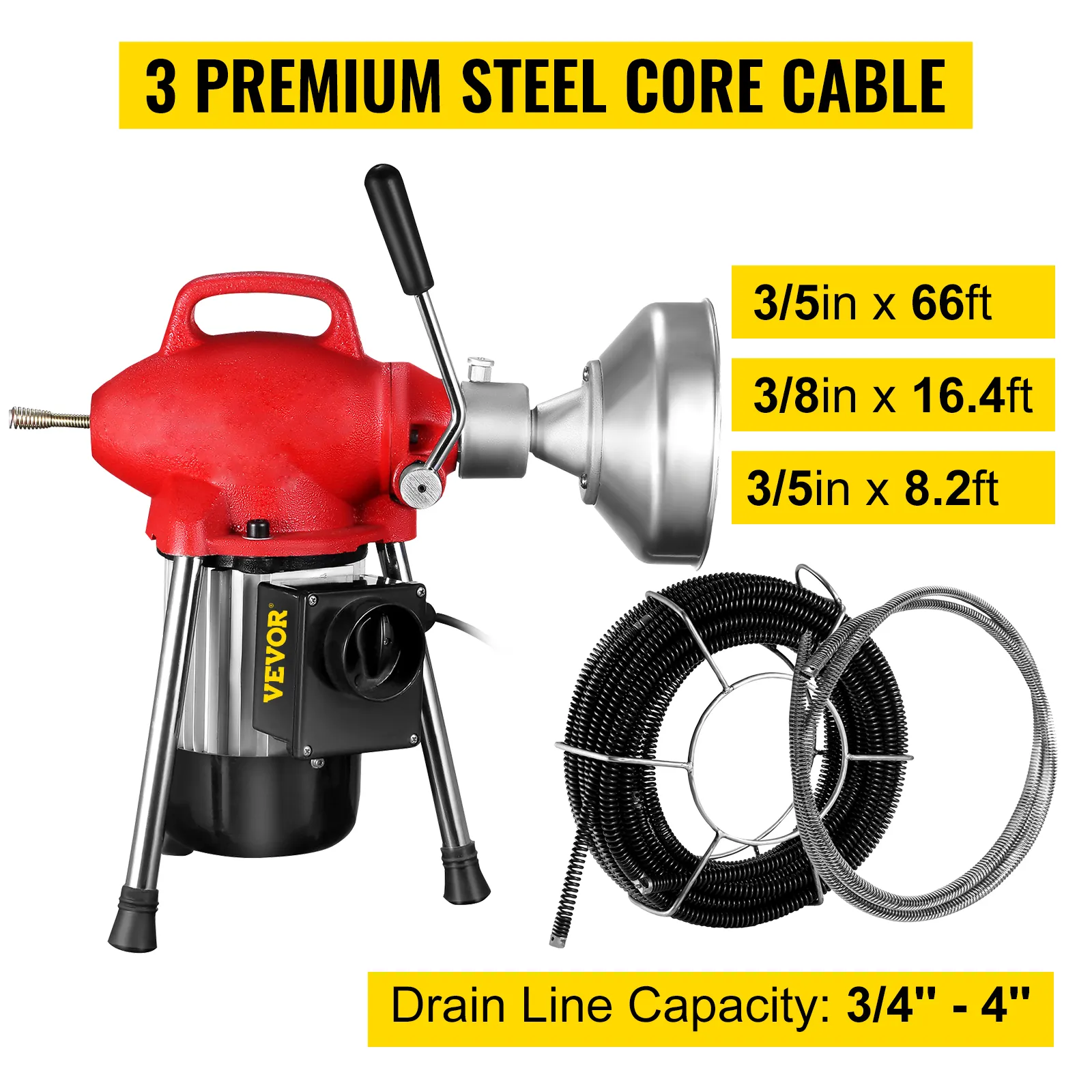 This premium steel core cable effectively resists breakage, tangling, kinking, and corrosion. The drain cleaner machine is suitable for 3/4'' - 4''/20-100mm pipe.