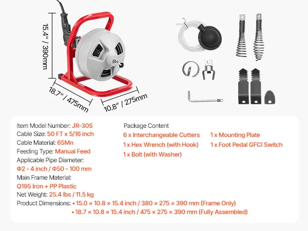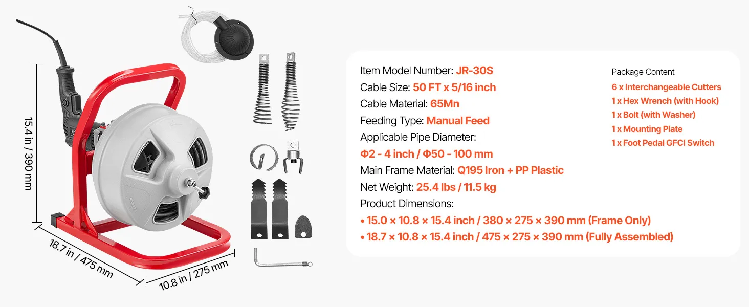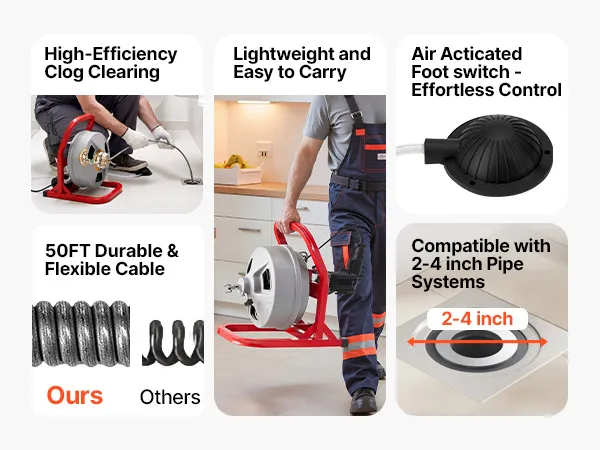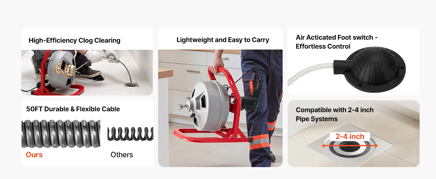 Easy Operation: Enhanced with CW/CCW control and an air-activated foot switch, cable management is effortless. You can easily switch rotation direction to suit different clogs, and the foot switch lets you start and stop the drain sewer auger hands-free