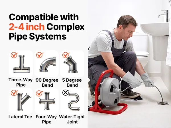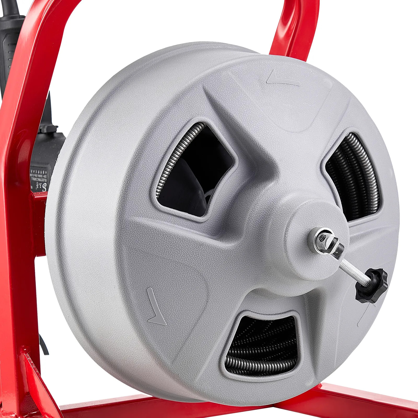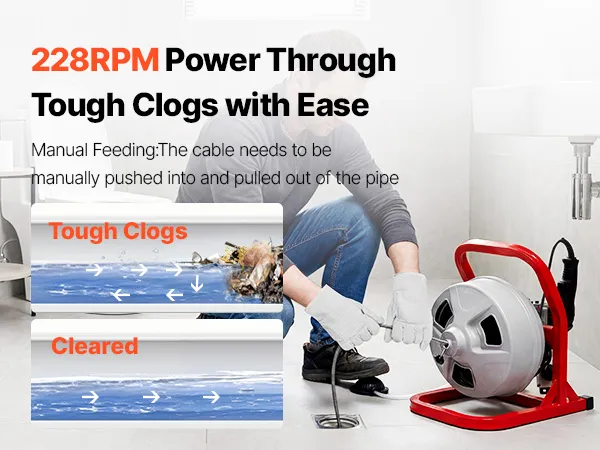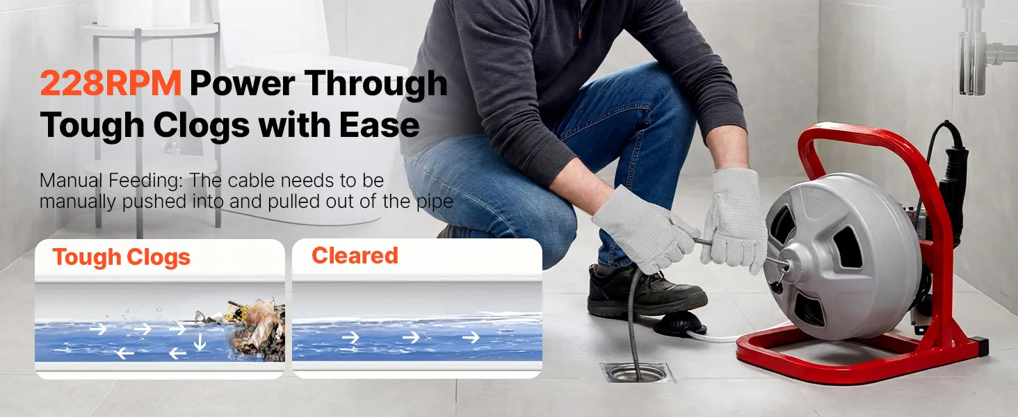 Efficient Clog Clearing: VEVOR drain cleaner machine adopts a manual feeding system, and the cable needs to be manually pushed into and pulled out of the pipe. Paired with a 228 RPM electric drill, it delivers steady rotation to clear blockages more effectively