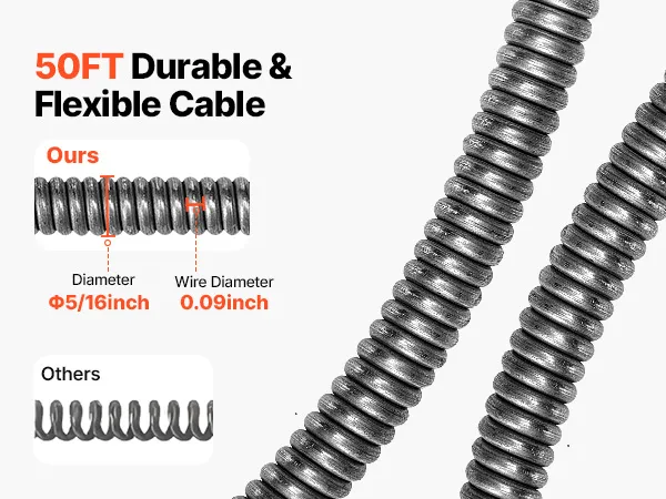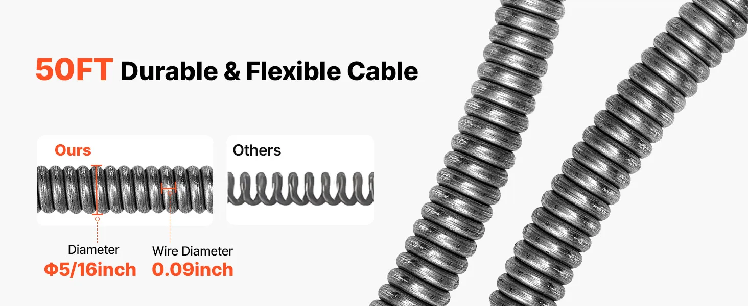 Durable Steel Cable: Our 15m x 8mm premium steel cable fits 50mm to 100mm pipes, resisting breakage, twisting, and corrosion for easy navigation through pipes. Reduced tangles and jamming deliver a smoother and more efficient clearing experience