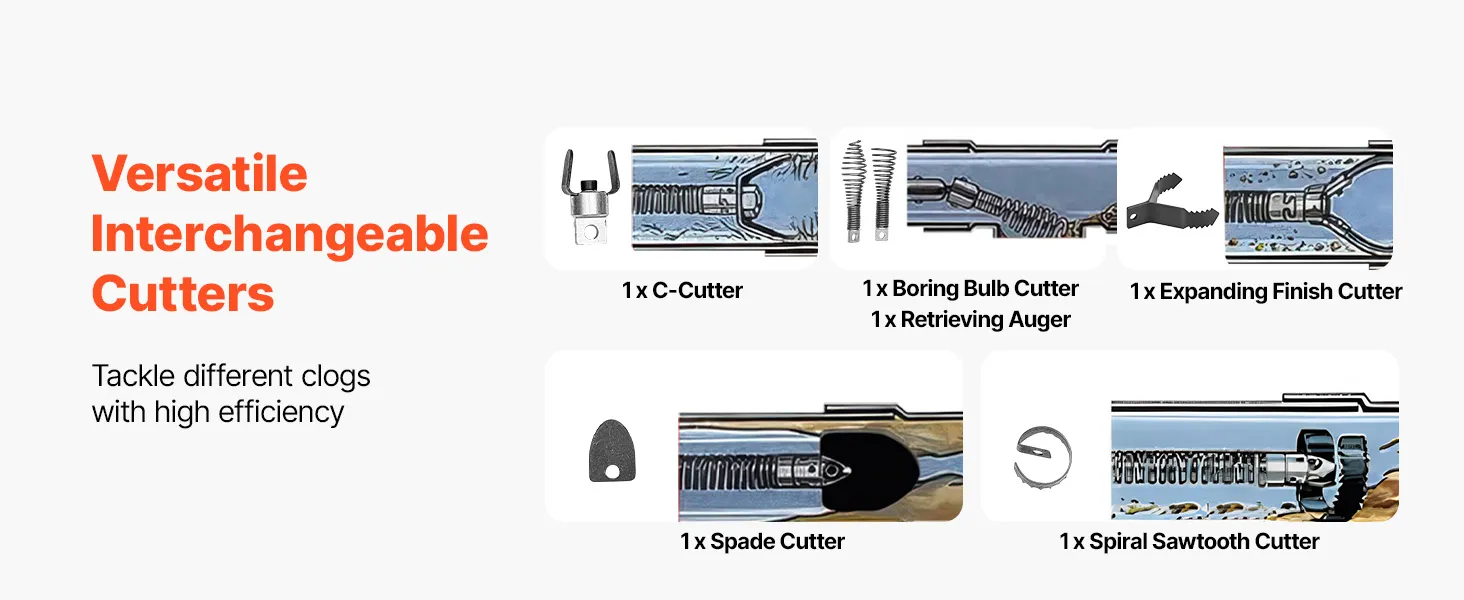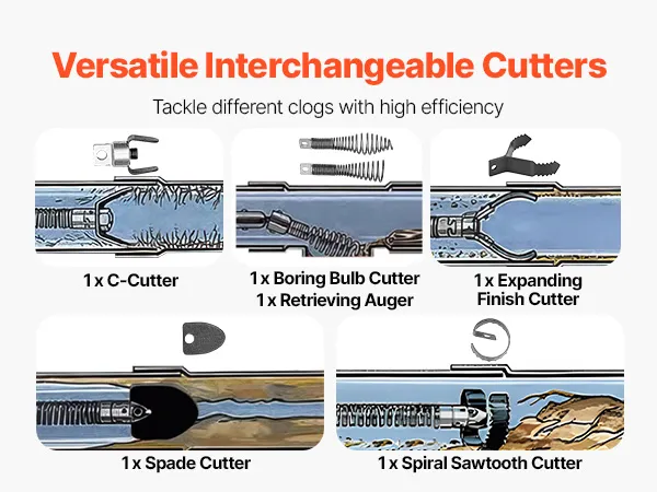 Versatile Cutters: Equipped with 6 interchangeable cutters, this electric drain auger handles various clogs. Replace the cutter head to clear blockages in drain pipes, sinks, sewers, toilets, and more, reducing bad odors and troublesome maintenance hassle