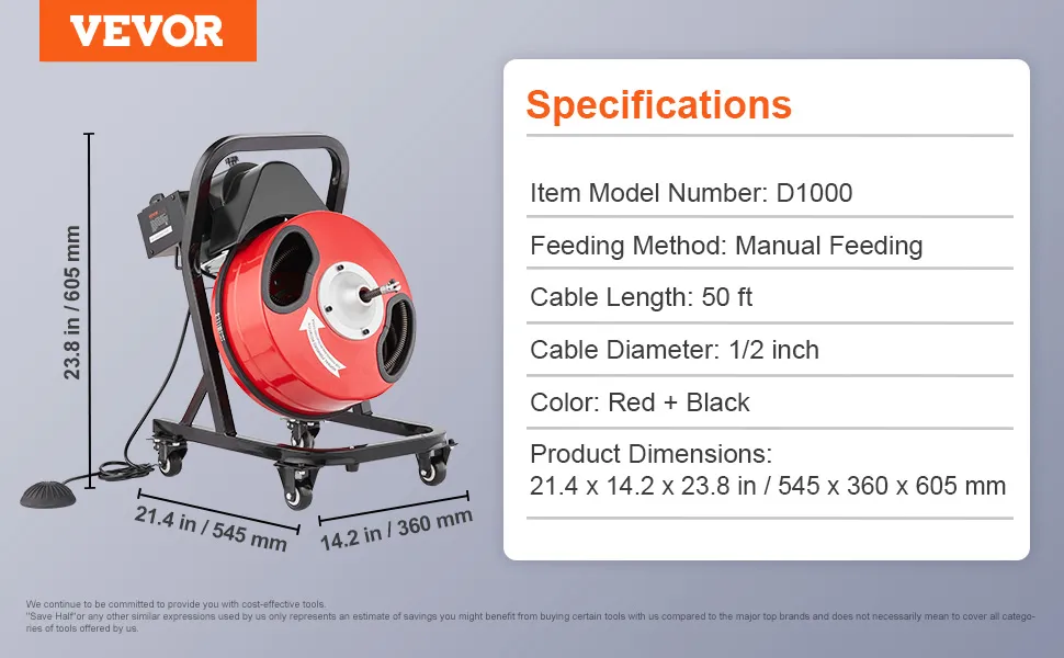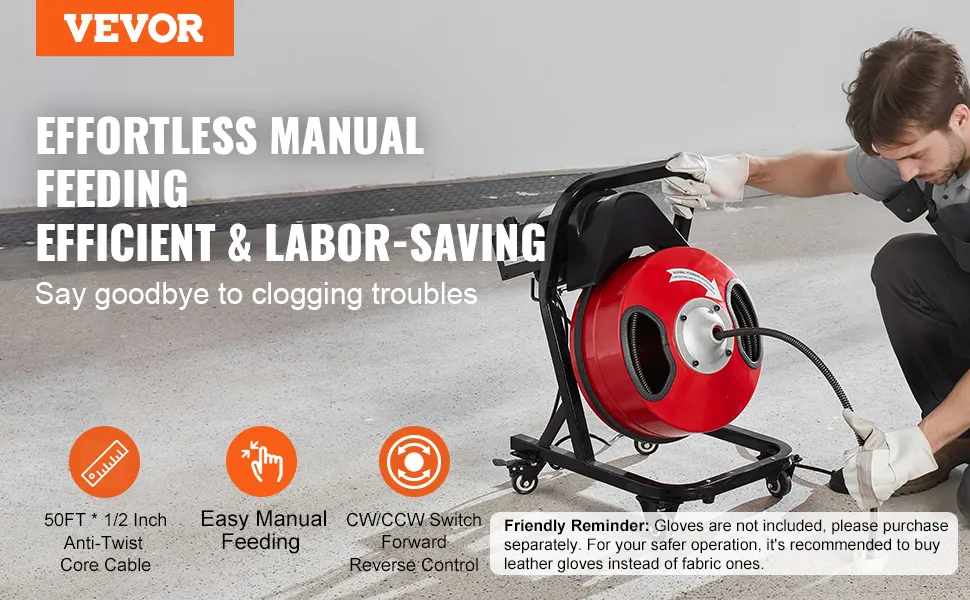 Are you tired of clogged drainage pipes, expensive plumbing services, and incomplete unclogging? Say bye to unpleasant smells and trouble maintenance! Let VEVOR electric drain cleaning machine with 50 FT x 1/2 In solid core cable solve all blockage problems in one go without any worries!