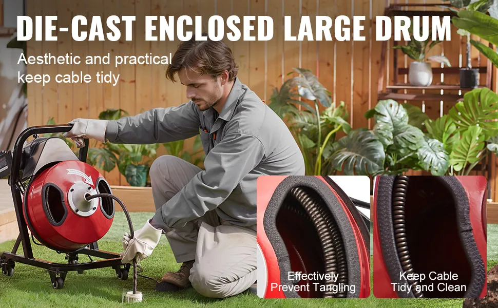 Moveable and Portable: This drain cleaning machine is equipped with smooth-rolling wheels, enabling effortless movement. The ergonomic handle provides a comfortable grip, making it ideal for both professionals and DIY enthusiasts tackling plumbing tasks