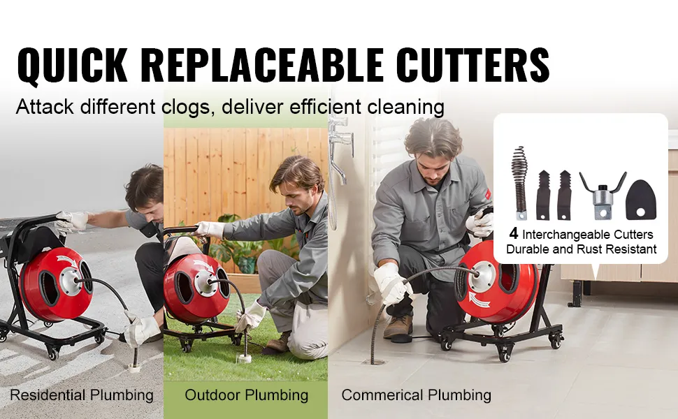 With 4 quick-change cutters included, this sewer machine excels in clearing various blockages, making it ideal for professional drain cleaning tasks. From unclogging toilets to sinks and floor drains, it offers versatile applications in homes, offices, and public spaces.