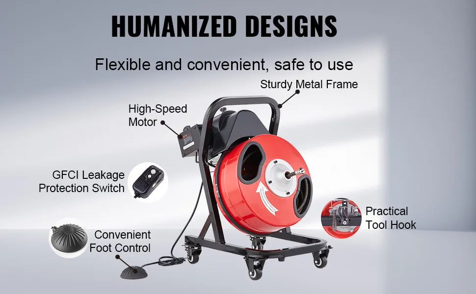 Powerful & Safe: Our drain auger features a high-quality motor, running at high speed for efficient drain cleaning. It also includes a GFCI switch to protect the operator from electrical shock and tool hooks for the cutter's convenient storage