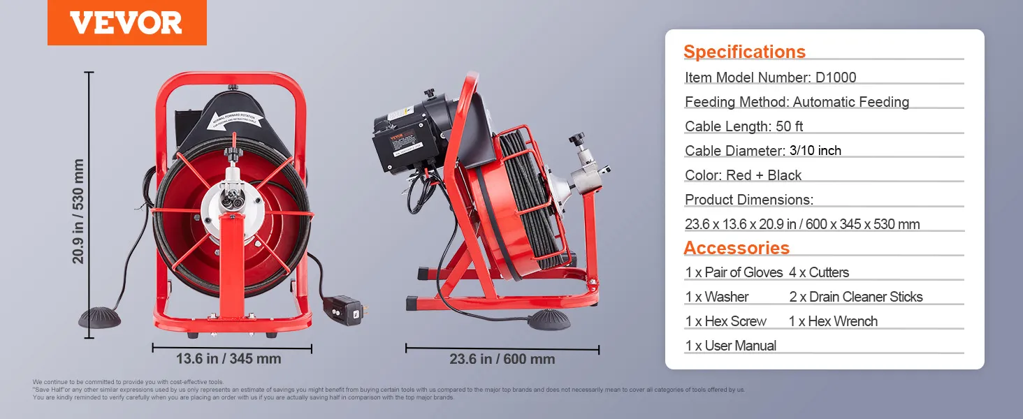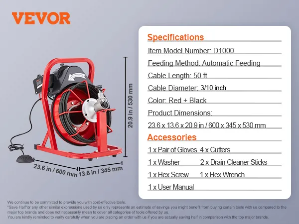 Are you tired of clogged drainage pipes, expensive plumbing services, and incomplete unclogging? Say bye to unpleasant smells and trouble maintenance! Let VEVOR electric drain cleaning machine with 50 FT x 3/10 In solid core cable solve all blockage problems in one go without any worries!