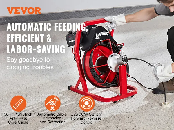 Attack Stubborn Clogs: VEVOR drain cleaner machine features an automatic feed control system to power the cable in and out of drainage pipes. Enhanced with CW/CCW control and air-activated foot switch, managing the cable becomes more effortless