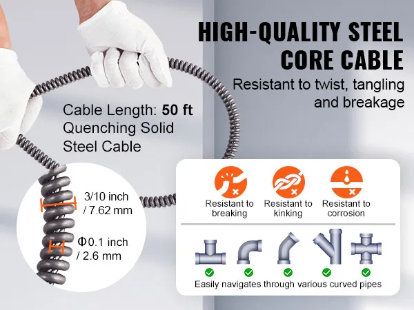 Premium Steel Core Cable: Our 50 FT x 3/10" steel core cable boasts superior resistance to breakage, twisting, and corrosion. It smoothly navigates through complex curved pipes ranging from 2 to 4 inches, ensuring reliable performance in tough jobs