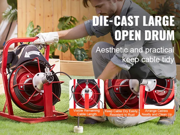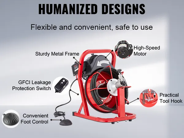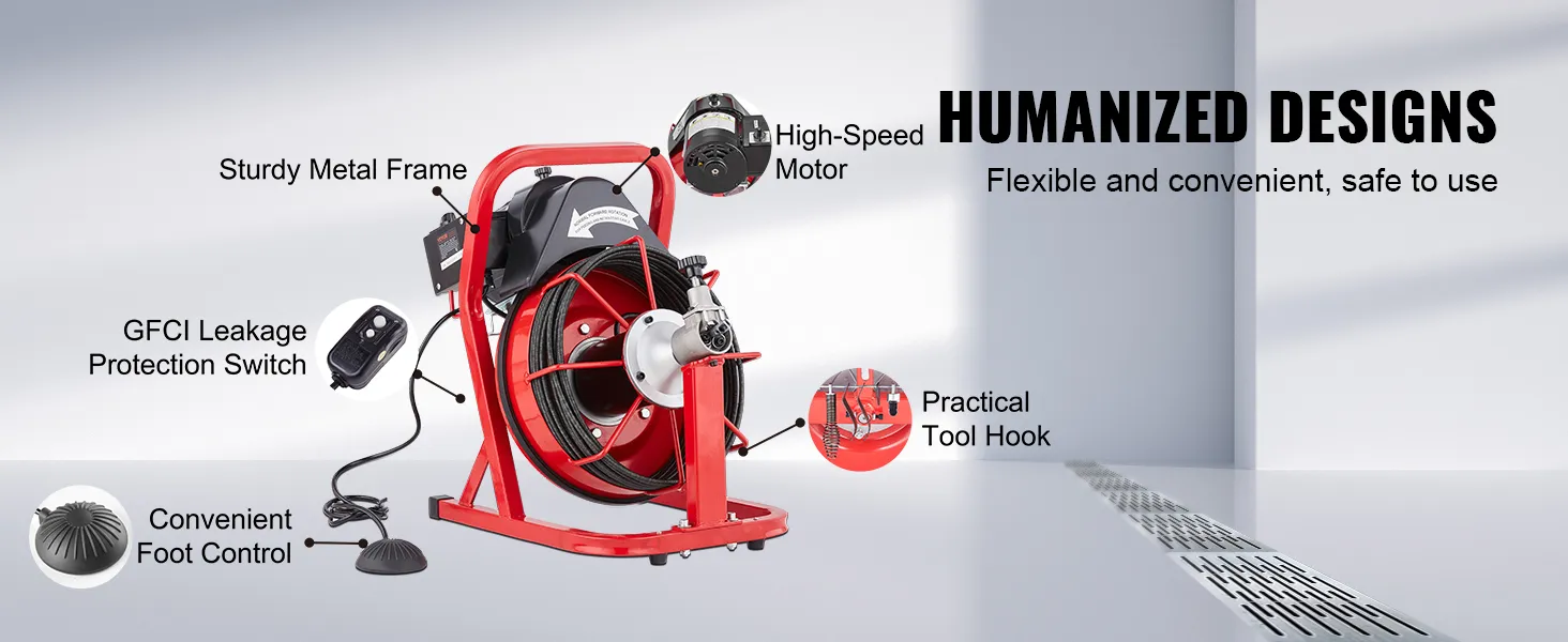 Convenient Open-Case Design: The sewer drain auger features an open-case drum for easy cleaning and maintenance, allowing real-time monitoring of the cable length. It also includes a GFCI switch for safety and tool hooks for cutter's convenient storage