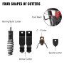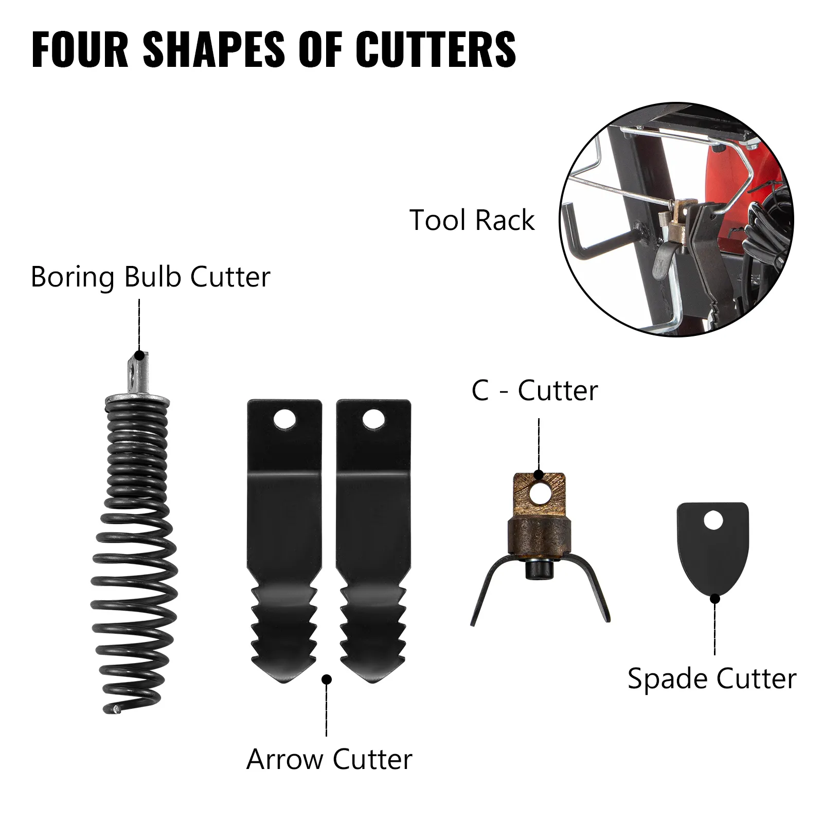 Arrow cutter is for cutting and scraping; boring bulb cutter removes loose objects; c-cutter cleans grease stoppages and wall of the pipe; spade cutter scrapes the inside edges of pipes. Besides, a small tool rack for convenient storage and tools change.