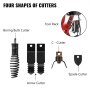 Arrow cutter is for cutting and scraping; boring bulb cutter removes loose objects; c-cutter cleans grease stoppages and wall of the pipe; spade cutter scrapes the inside edges of pipes. Besides, a small tool rack for convenient storage and tools change.