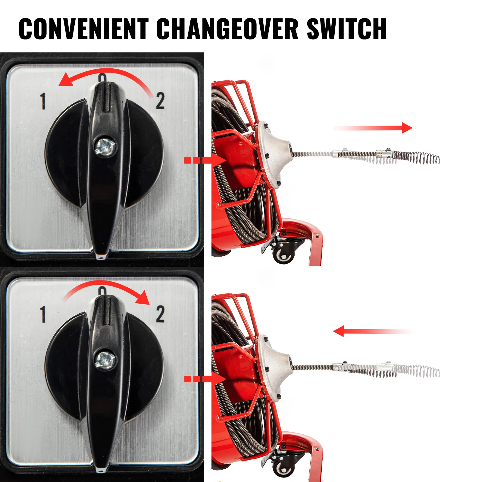 The drain cleaning tool has a changeover switch by which you can change the direction of the cable's move so that it is very easy for you to stretch the cable out or shrink it back.