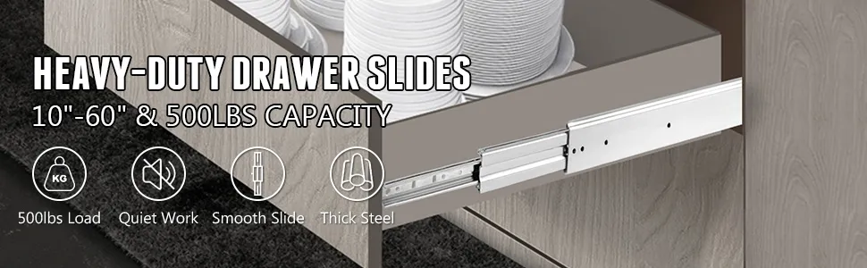 This is a pair of high-quality drawer slide kit for industrial & home use. It features a hefty 500 lbs load-bearing, a slide lock, and thick cold rolled steel material. The ball bearings inside make it slide smoothly and quietly. It is a great product which combines practical use and a beautiful look.