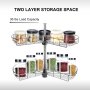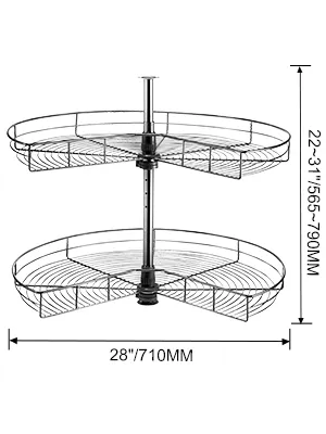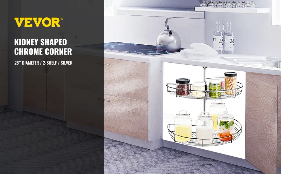 This kitchen corner cabinet organizer features 28" diameter and two-layer storage shelves, sturdy enough to hold objects up to 36 lbs, creating space for kitchen gadgets, bakeware, pans, or dry goods.
