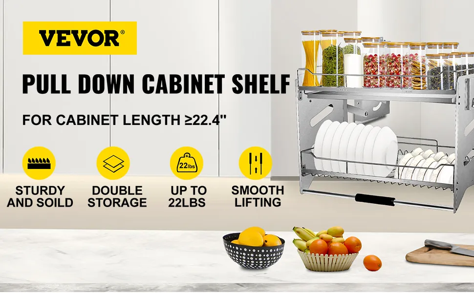 Our pull down kitchen shelves features 304 stainless steel and carbon steel, heavy-duty and rust-proof. The thick wire structure provides durability and elegance, and the maximum load capacity is up to 22 lbs / 10 kg.