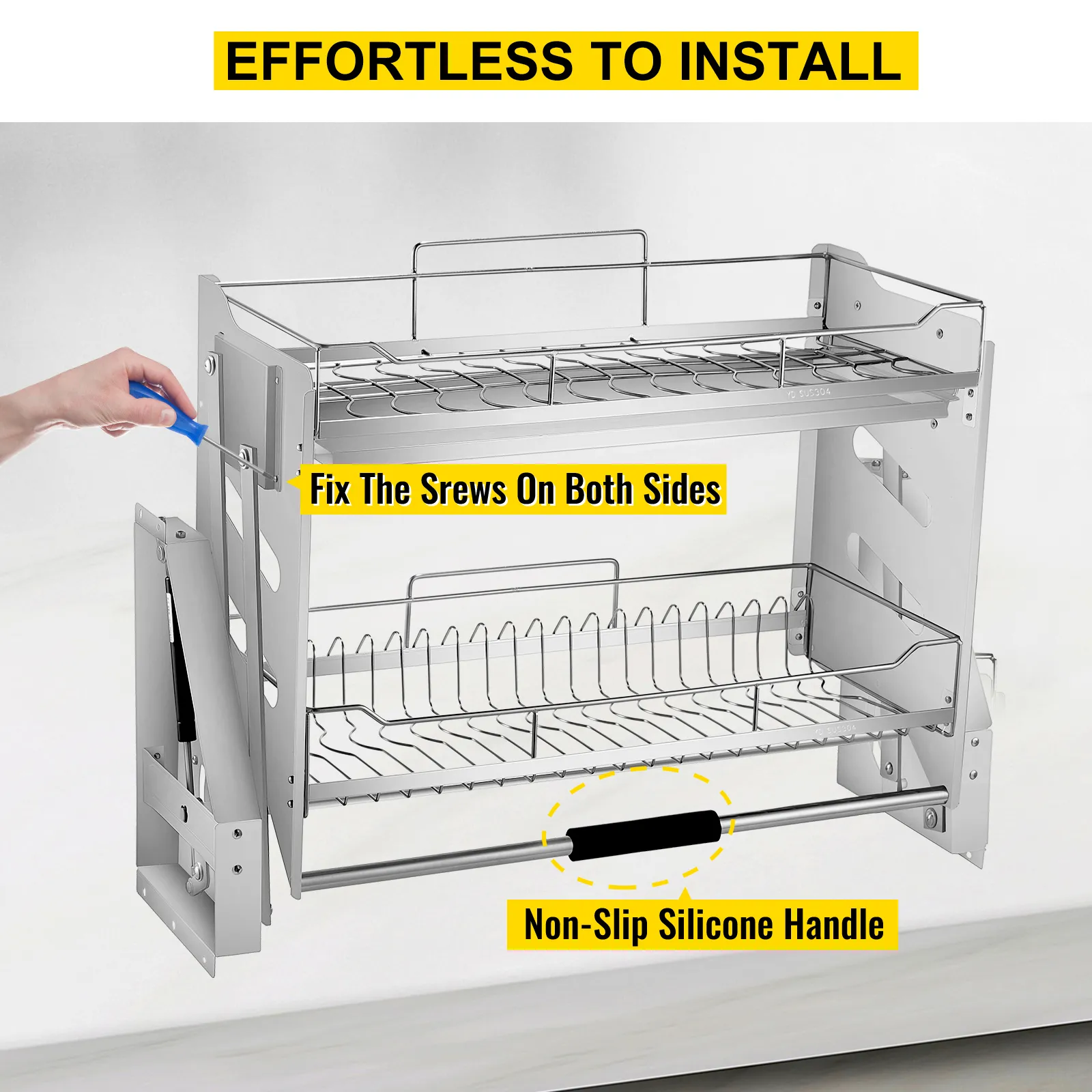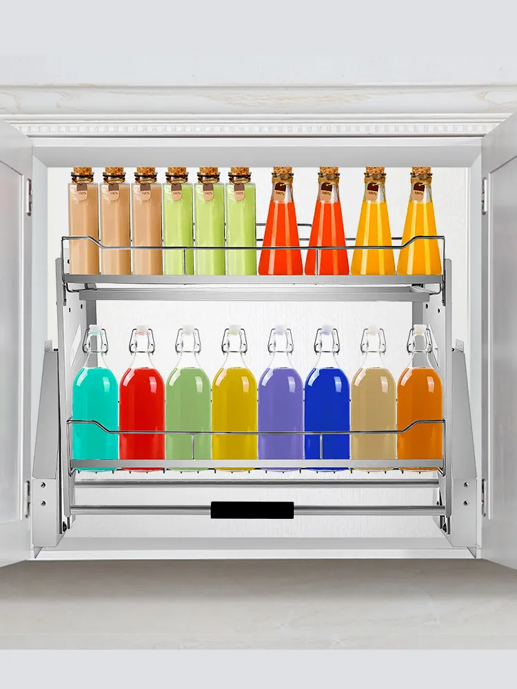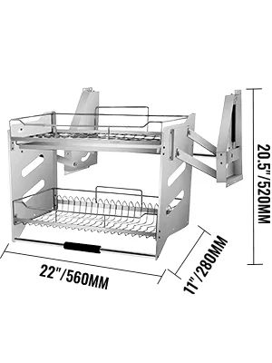 Our pull down shelf is a 304 stainless steel two-layer frame, which can help you pick up high objects and greatly enhance space utilization. The unique gas-assisted lifting mechanism provides super stability over the entire range of motion. It is effortless to install, and it's an excellent choice to become an indispensable assistant in your kitchen!