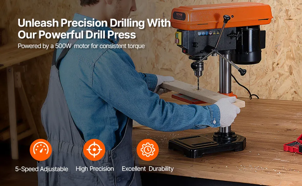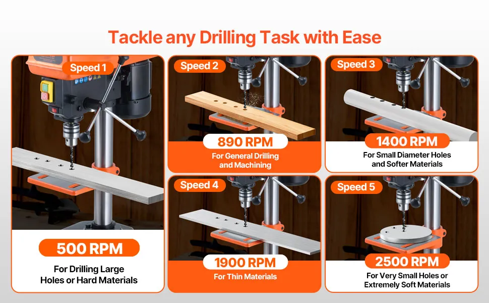 Variable 5-Speed Control: Customize your drilling experience with five adjustable speeds ranging from 500 to 2500 RPM. Effortlessly switch between speeds by adjusting the belt, our bench drill press allowing you to tackle a variety of materials and projects with precision.