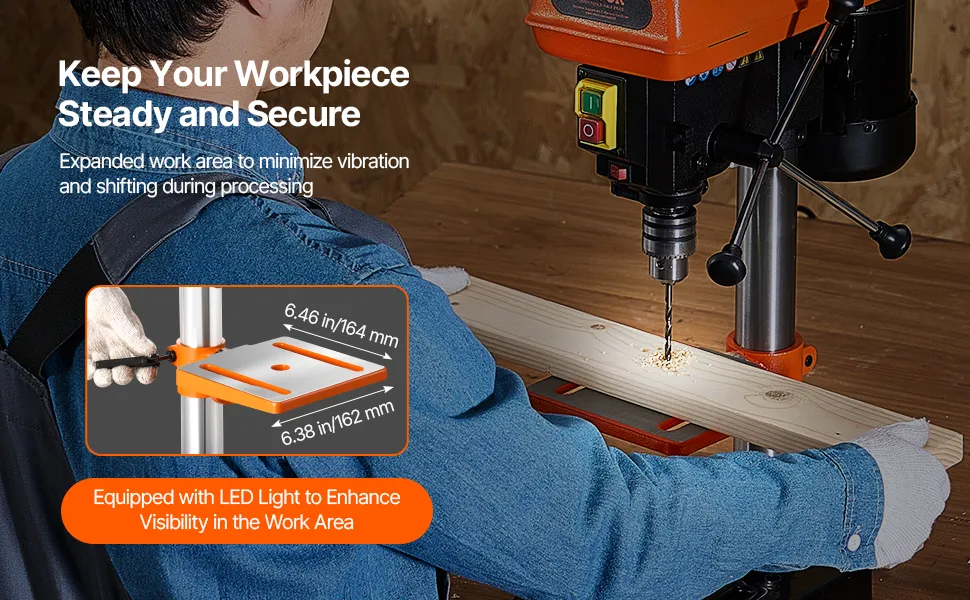 Bright LED Work Light: Never miss a detail with the integrated LED work light. Our LED work light of benchtop drill press illuminates your workspace, providing clear visibility and making it easy to work accurately and efficiently even in dimly lit conditions.