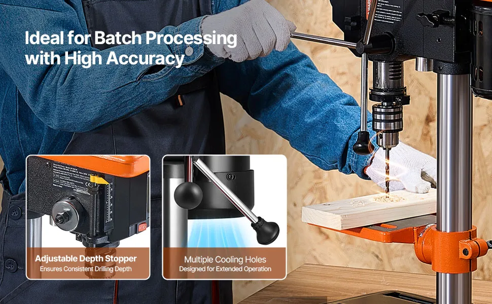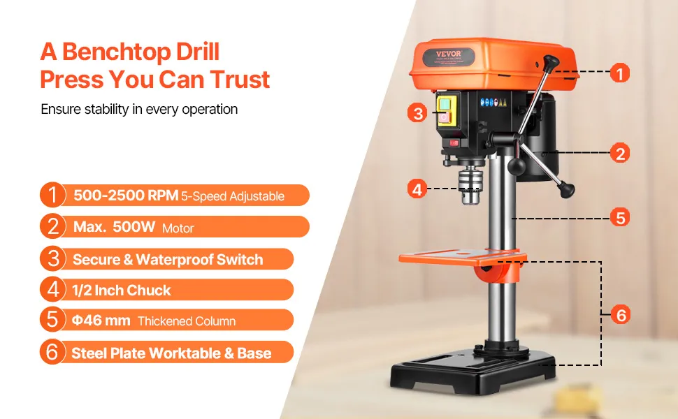 Exceptional Drilling Performance: Powered by a robust 500W induction motor, this benchtop drill press delivers superior power and stability, ensuring top-notch performance even during extended drilling sessions.