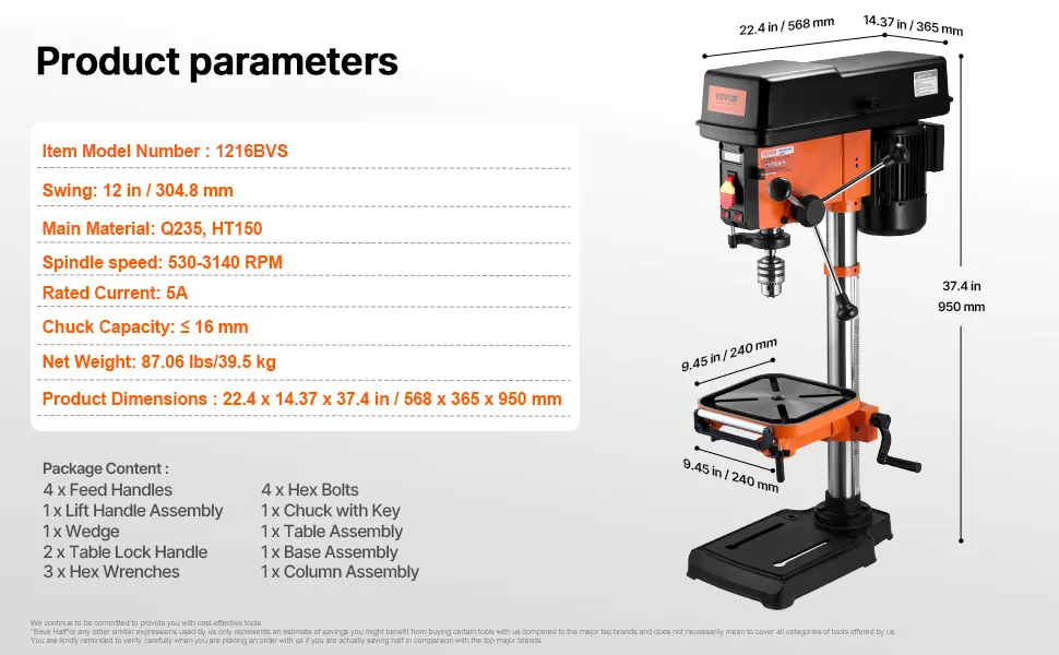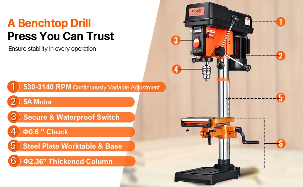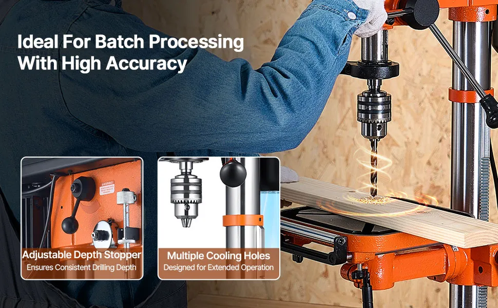 Exceptional Drilling Performance: Equipped with a powerful induction motor delivering up to 750W of output, this benchtop drill press ensures enhanced power and stability during extended operations. Enjoy consistent performance even during prolonged use.