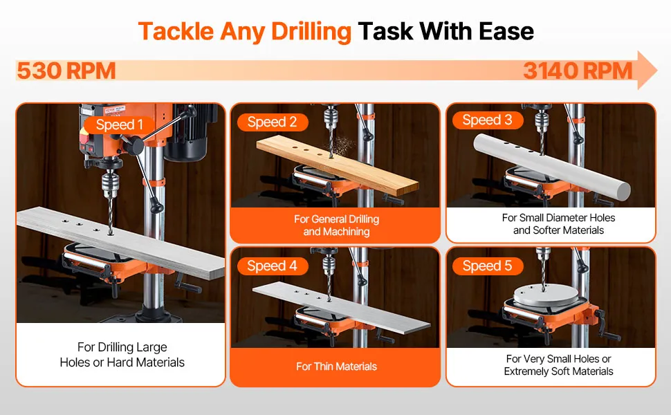 Continuously Variable Speed Adjustment: The speed adjustment lever allows for stepless control of the bench drill press speed, ranging from 340-2200 RPM, with speeds clearly displayed on a digital screen. Tackle any material or complex task with ease!