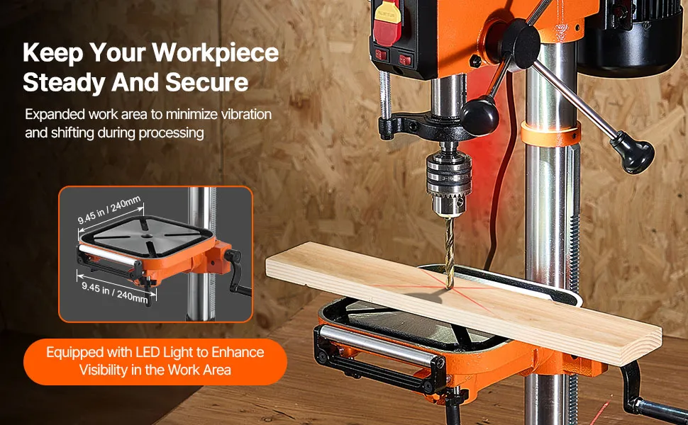 Adjustable Worktable: The thickened metal worktable supports a 150 mm extension and offers height and 45° angle adjustments. Enjoy the flexibility and stability you need for complex drilling tasks, making this drill press an essential tool for any DIY enthusiast.