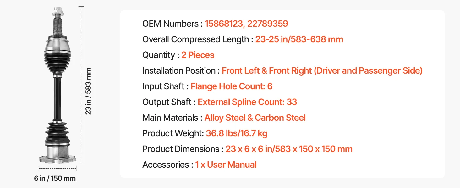 OEM-Level Precision: OEM Numbers: 15868123, 22789359; Overall Compressed Length: 23–25 in (583–638 mm). The CV joint axle features a 6-hole flange input shaft and 33-tooth external spline output shaft. It ensures a secure and accurate hub connection