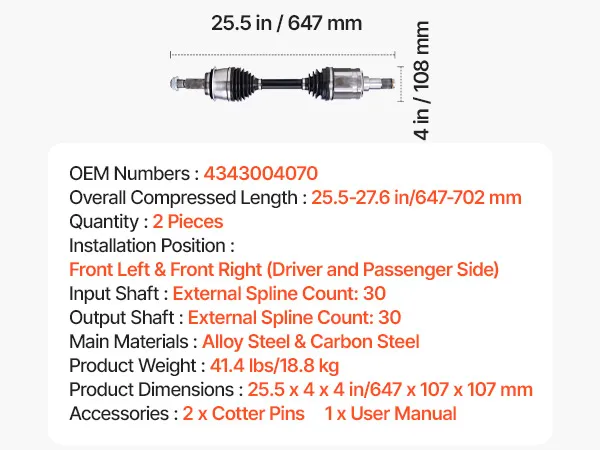 OEM-Level Precision: OEM Number: 4343004070; Overall Compressed Length: 25.5–27.6 in (647–702 mm). Both the input and output shafts feature 30-tooth external splines. Our CV joint axle ensures a secure and accurate hub connection