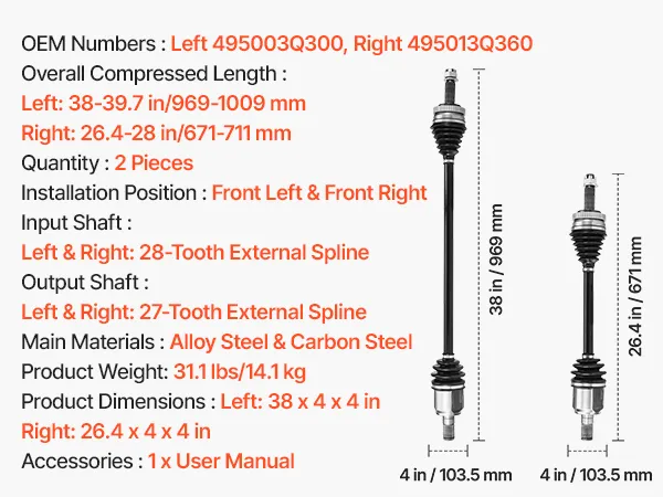 OEM-Level Precision: OEM Numbers: Left 495003Q300, Right 495013Q360; Overall Compressed Length: Left 38–39.7 in, Right 26.4–28 in. The CV joint axle features a 28-tooth external spline input shaft and 27-tooth external spline output shaft