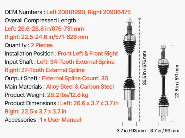 OEM-Level Precision: OEM Numbers: Left 20881990, Right 20906475; Overall Compressed Length: Left 26.6–28.8 in, Right 22.5–24.6 in. Input Splines: 34 Teeth (Left), 27 Teeth (Right); Output Splines: 30 Teeth. The CV joint axle ensures a precise hub fit