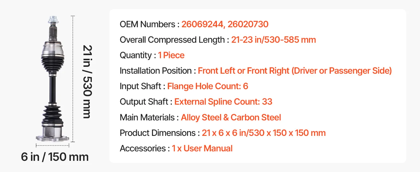 OEM-Level Precision: OEM Numbers: 26069244, 26020730; Overall Compressed Length: 21–23 in (530–585 mm). The CV joint axle features a 6-hole flange input shaft and 33-tooth external spline output shaft. It ensures a secure and accurate hub connection