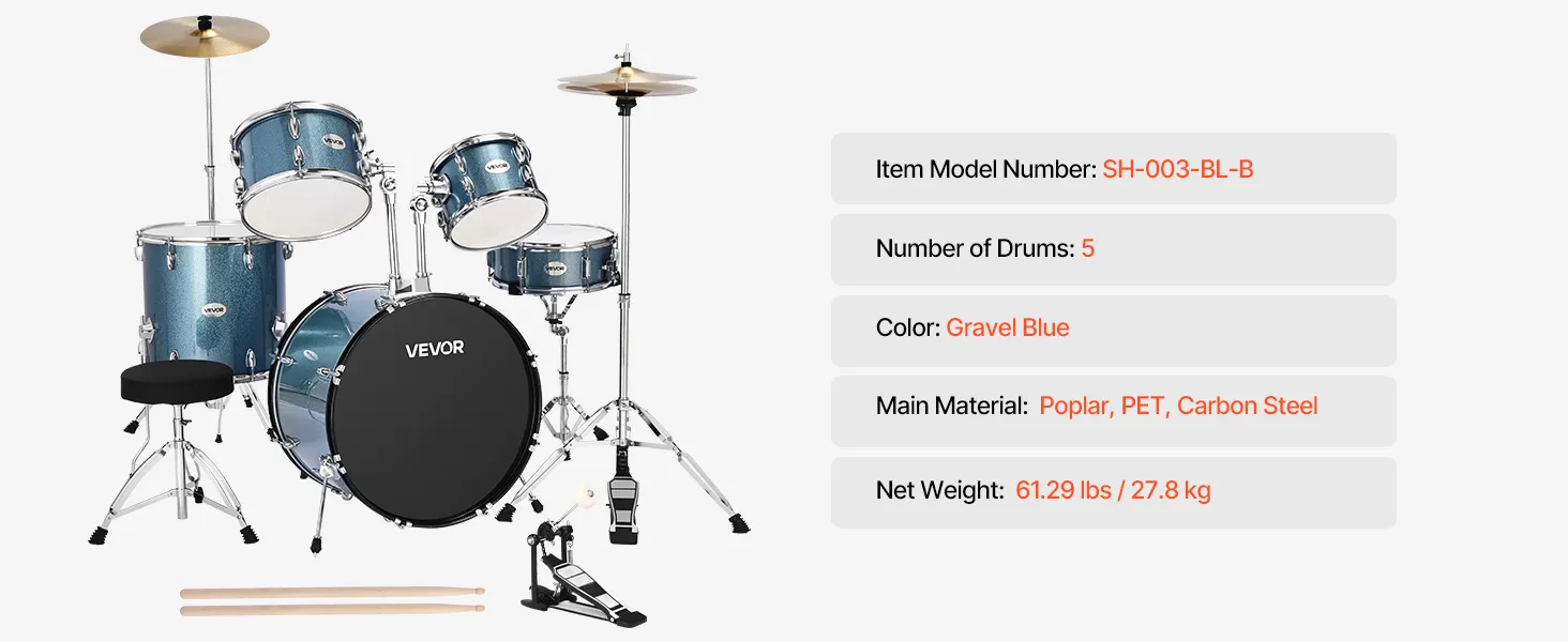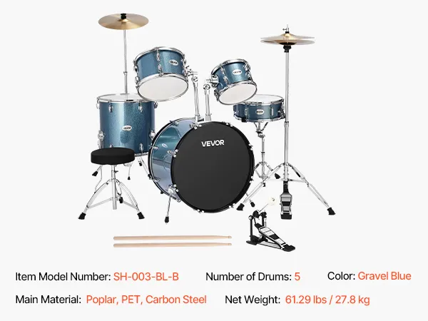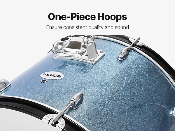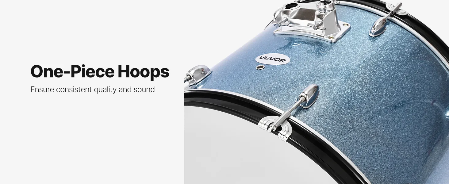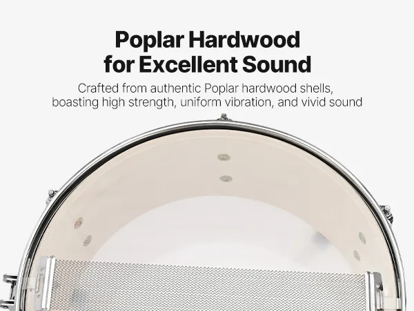 Q: Is the quality of this drum set durable? A: The drum shells are made of poplar wood with electrophoresis, painting, and electroplating processes, ensuring both sturdiness and a sleek finish.