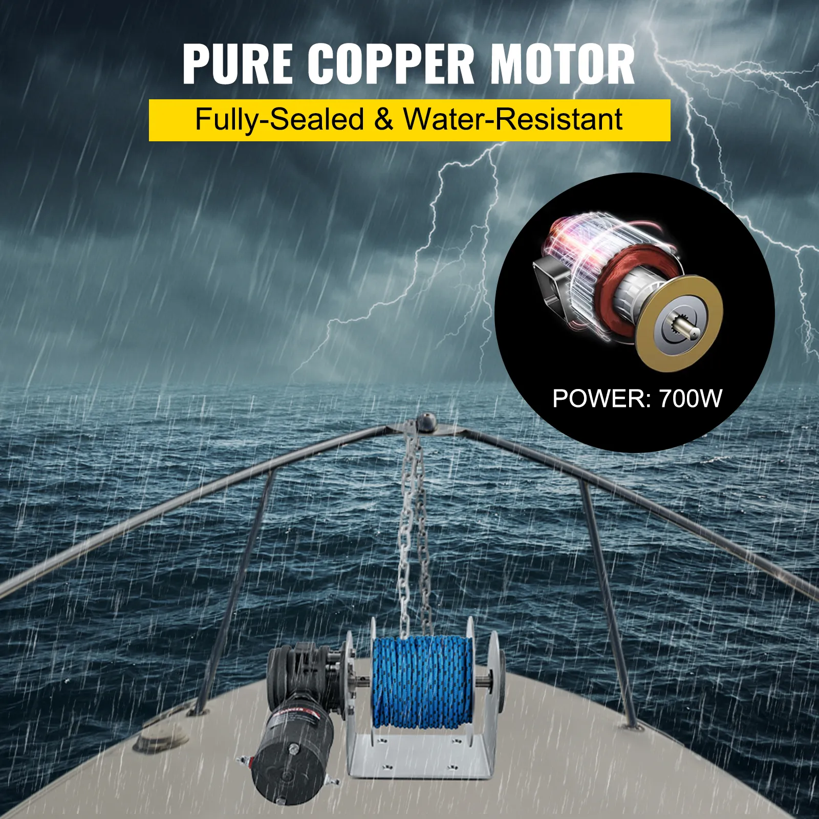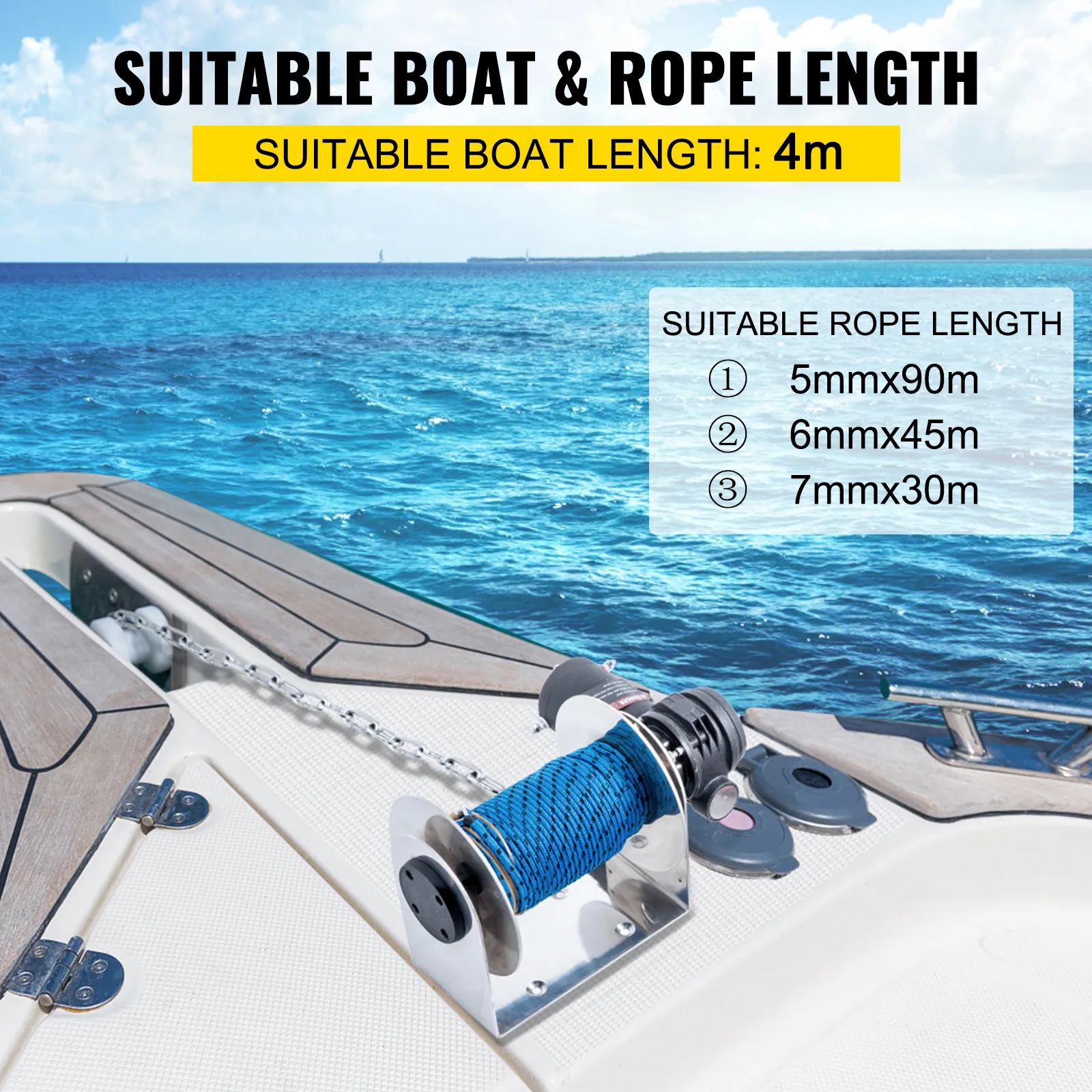 Our electric marine winch is ideal for the 4-meter boat. Besides, it is compatible with the ropes of 5 mm x 90 m, 6 mm x 45 m, and 7 mm x 30 m.