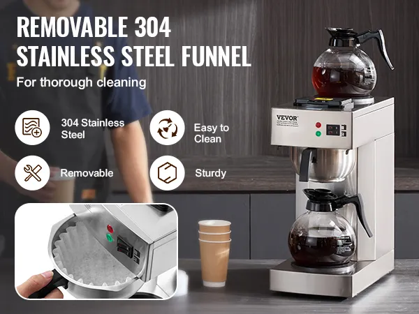 Easy Assembly and Cleaning: No assembly required - just plug it in and start brewing! The stainless steel body and removable stainless steel funnel make cleaning coffee grounds a breeze. A detailed tank cleaning guide is included to prevent hard-to-reach spots.