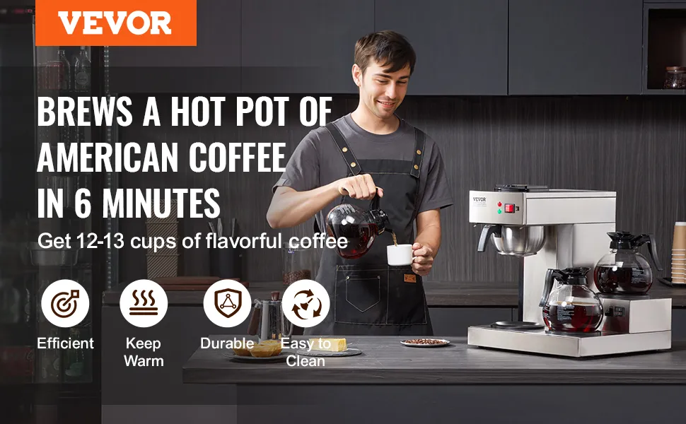 Efficient Coffee Brewing: The VEVOR commercial drip coffee maker brews a whole pot of coffee in just 6 minutes, producing 12-13 cups of delicious coffee without the wait.