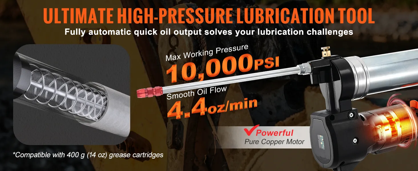 Our cordless grease gun packs a punch with a 200W pure copper motor, giving you that impressive 10,000 PSI power and pumping out 4.4 ounces of grease every minute.