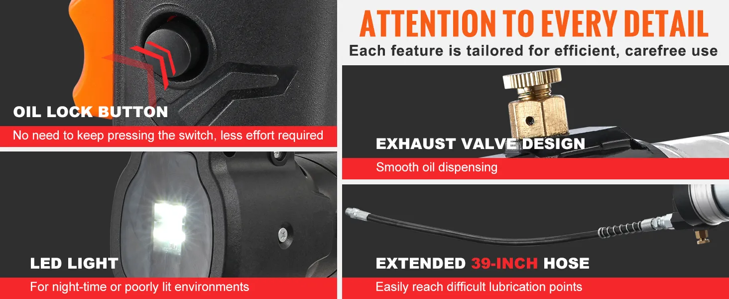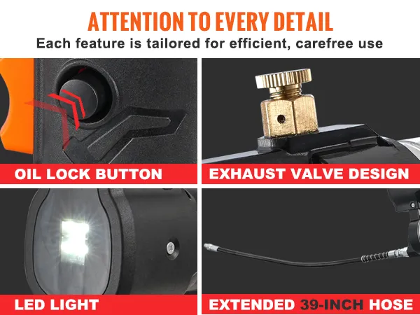 The grease gun's LED light keeps you going in low-light conditions. The 39-inch extended hose lets you reach those tricky spots with ease. Every detail is about making your work more convenient and efficient.