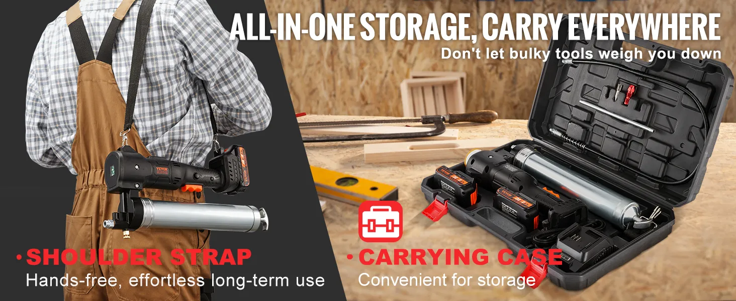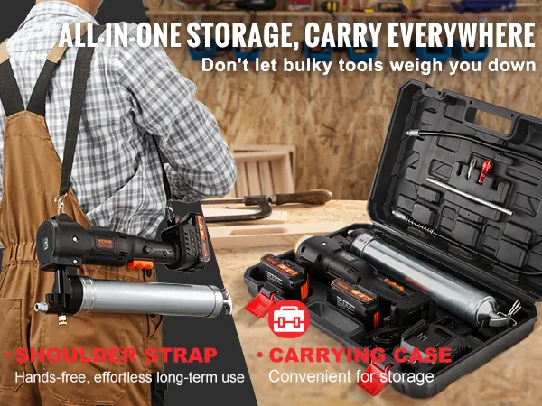 With a comfortable shoulder strap, you can take this power grease gun anywhere without breaking a sweat. The included carrying case keeps all your gear organized and easily transportable.