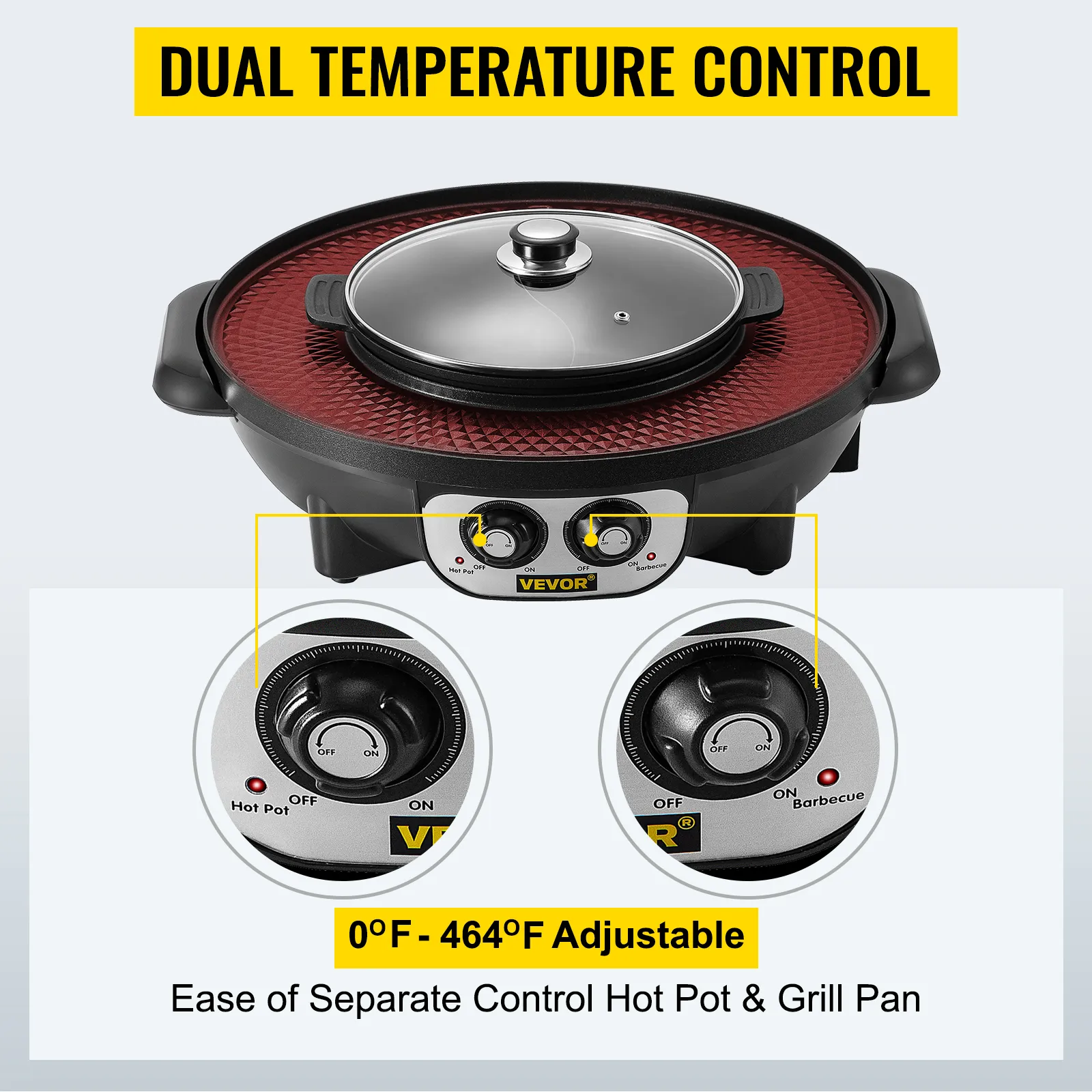 Two 0-464℉ temperature control knobs can adjust the heating temperature of the grill and hot pot respectively. It is ideal for you to enjoy grill or hot pot mode as you wish.