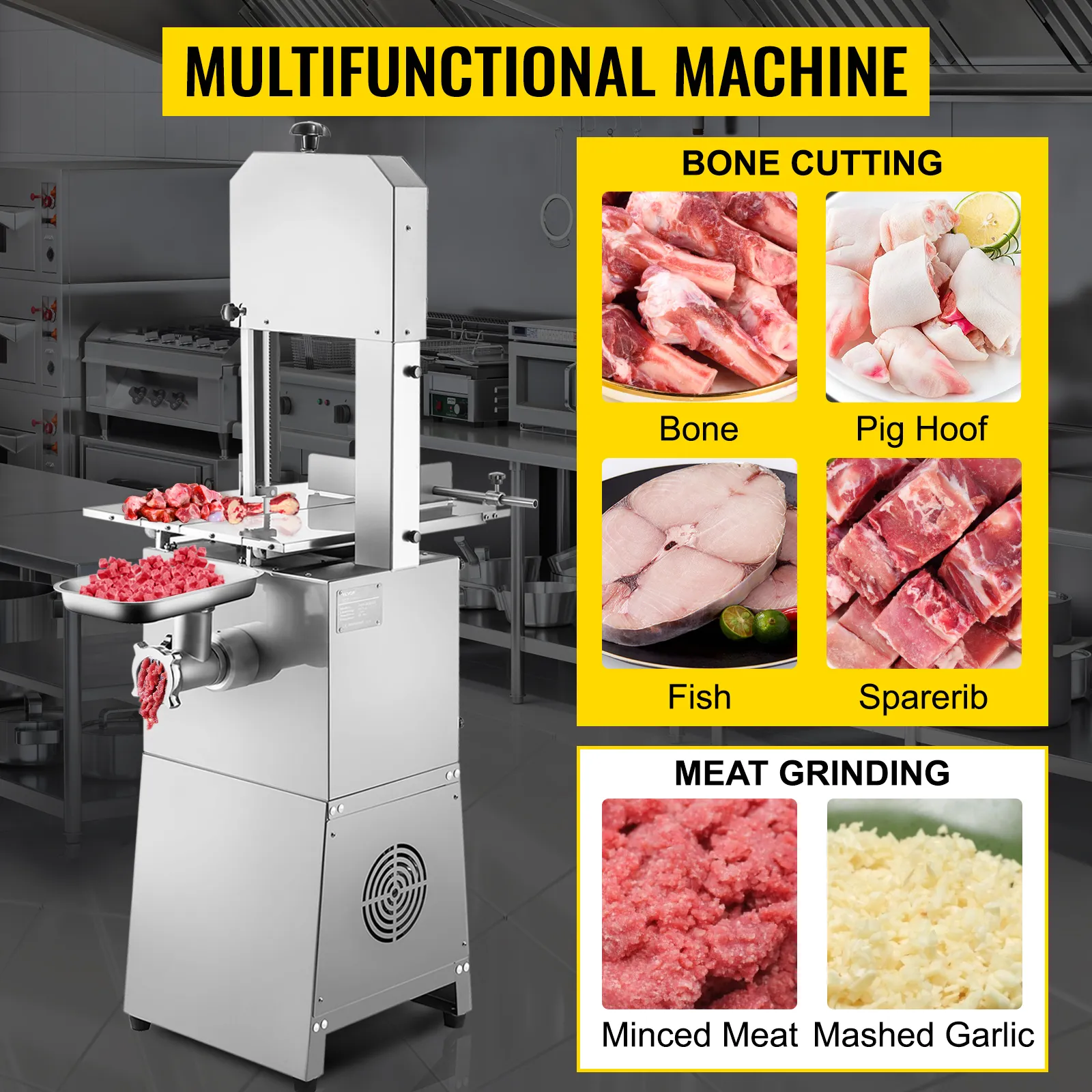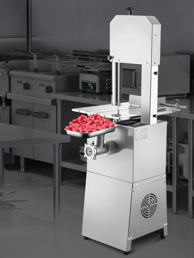 With this unique 2 in 1 automatic bone sawing machine, you can achieve the bone cutting and meat grinding idea simultaneously. It is widely used in cutting rib, pork, frozen fish, trotter, steak, chicken, duck, etc. Suitable for home kitchens, small restaurants, stores, markets, etc.