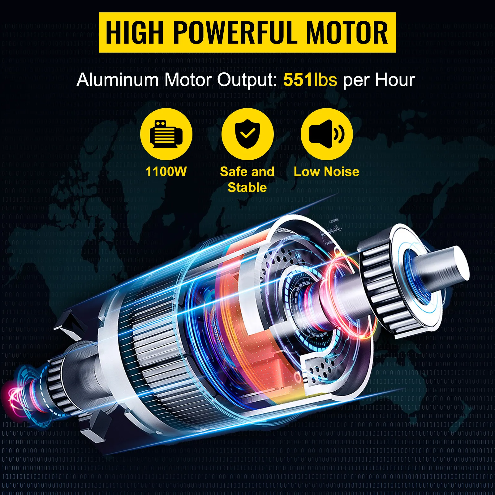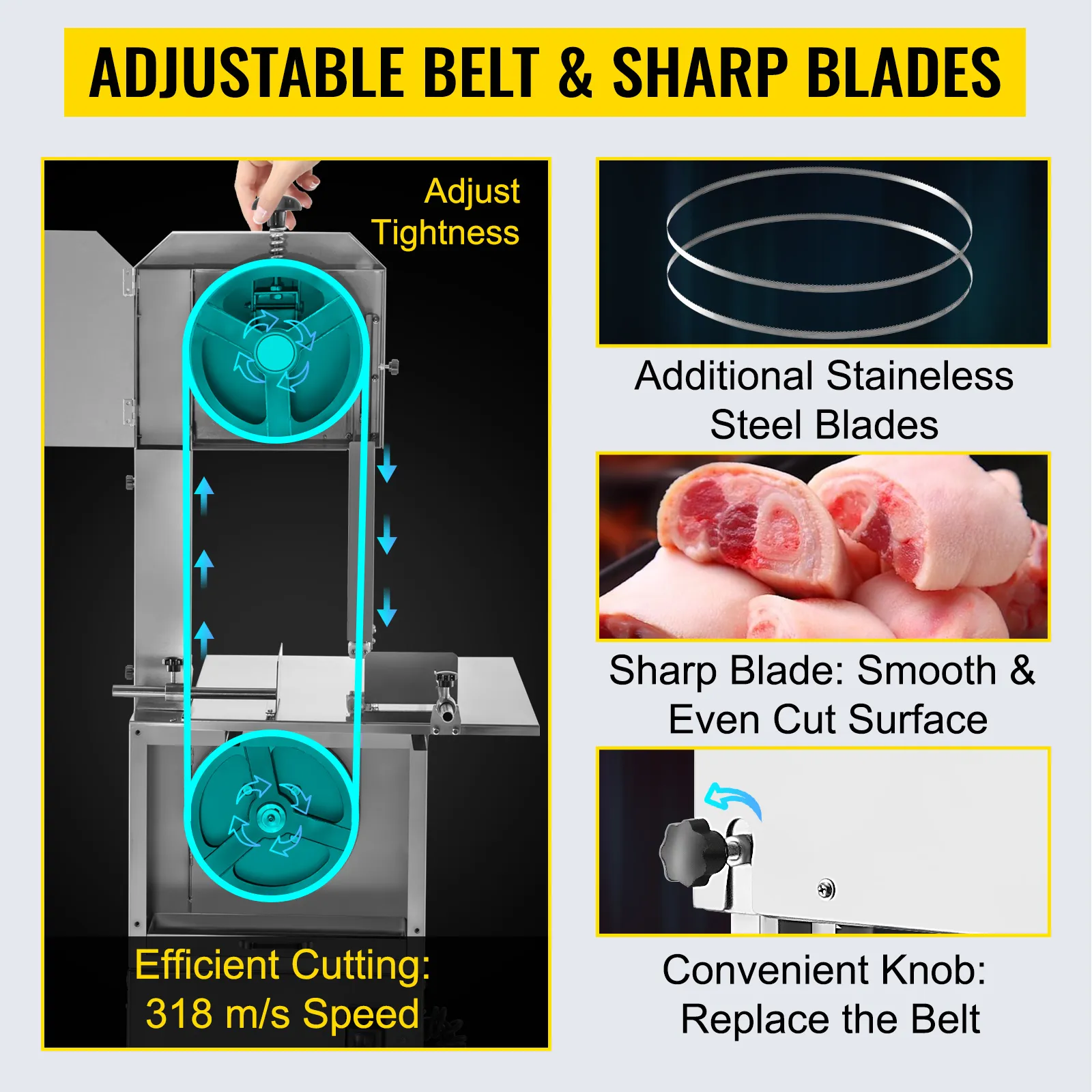 The powerful 1100W motor of the meat bone saw is built with aluminum material, low noise, high efficiency, and excellent performance, providing high blade rotating speed 318 r/min. In addition, the grinding capacity can be up to 551 lbs of meat per hour, significantly improving meat grinding efficiency.