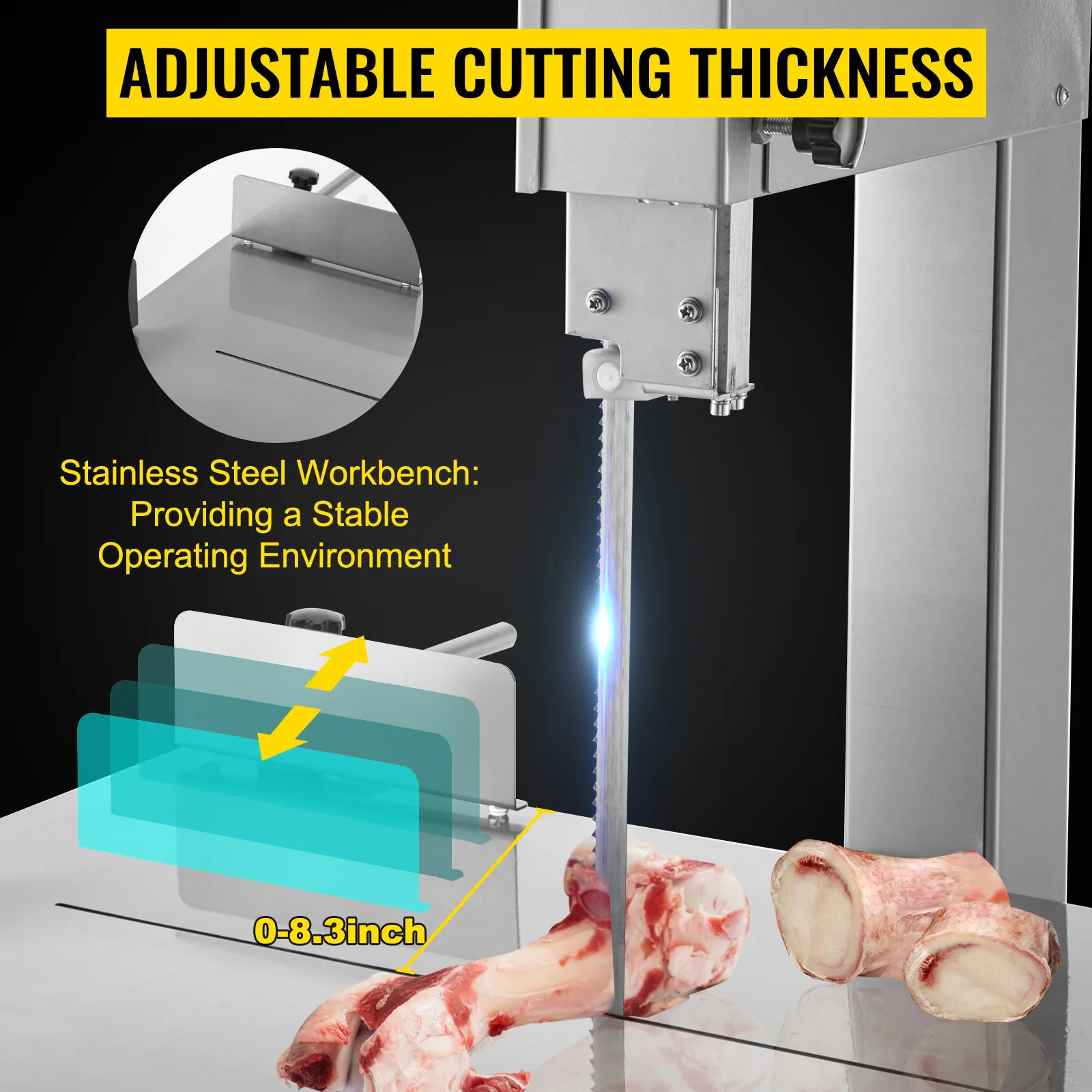 The tabletop electric band saw comes with an extensive working table, 23.6 x 18.3 in size, featuring an adjustable thickness of 0-8.3 inches suitable for large and small pieces of meat. The sliding feeding tube is designed to offer labor-saving convenience, making movement fast, simple, and stable. In addition, the slight push slab with a handle is easy to apply force.