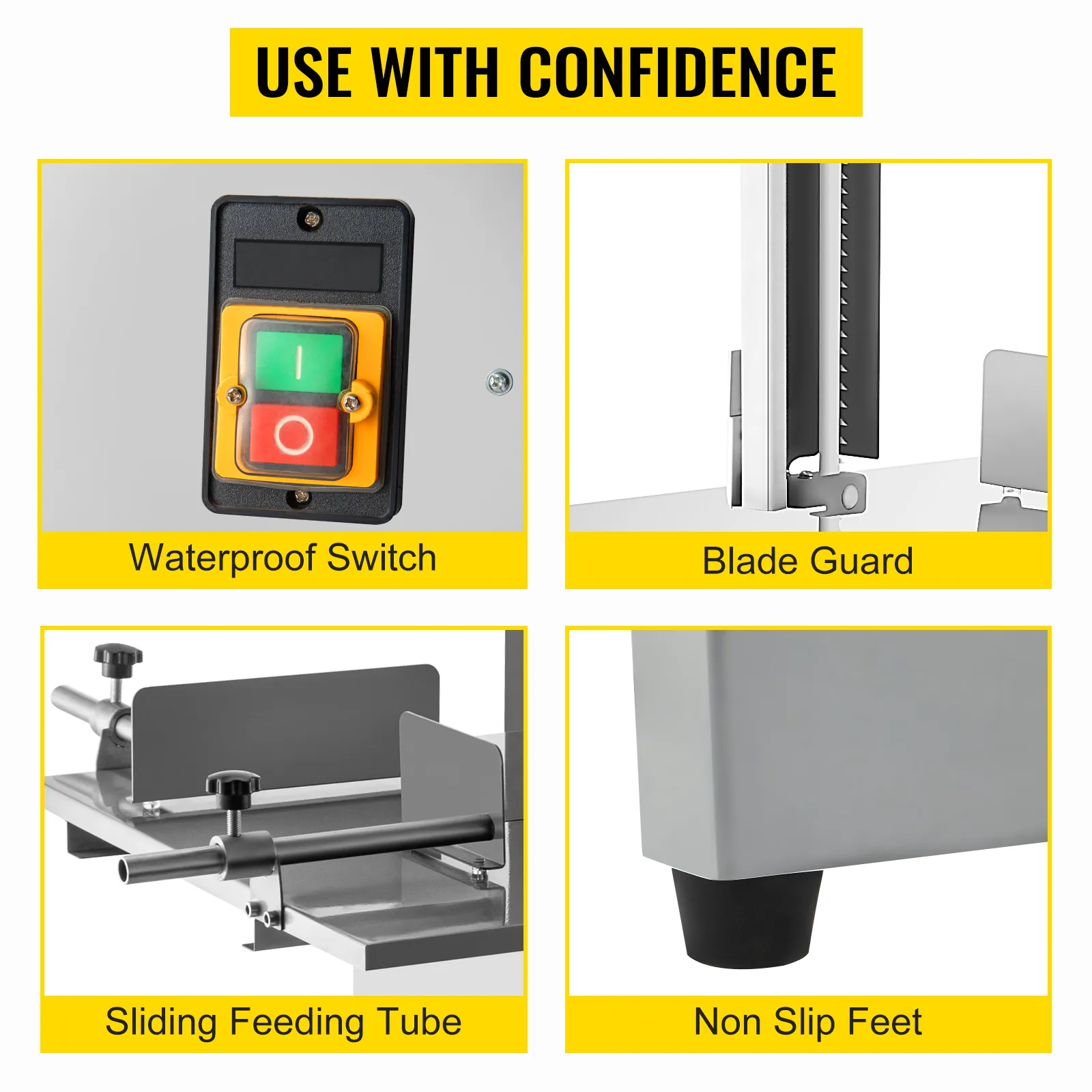 The commercial bone cutting machine is applied with various guarding devices like a blade guard, slide feeding tubes, a waterproof switch, and four non-slip bases, keeping your hands away from sharp saw blades and improving the machine's stability. In addition, these devices can make sure a smooth cutting process.