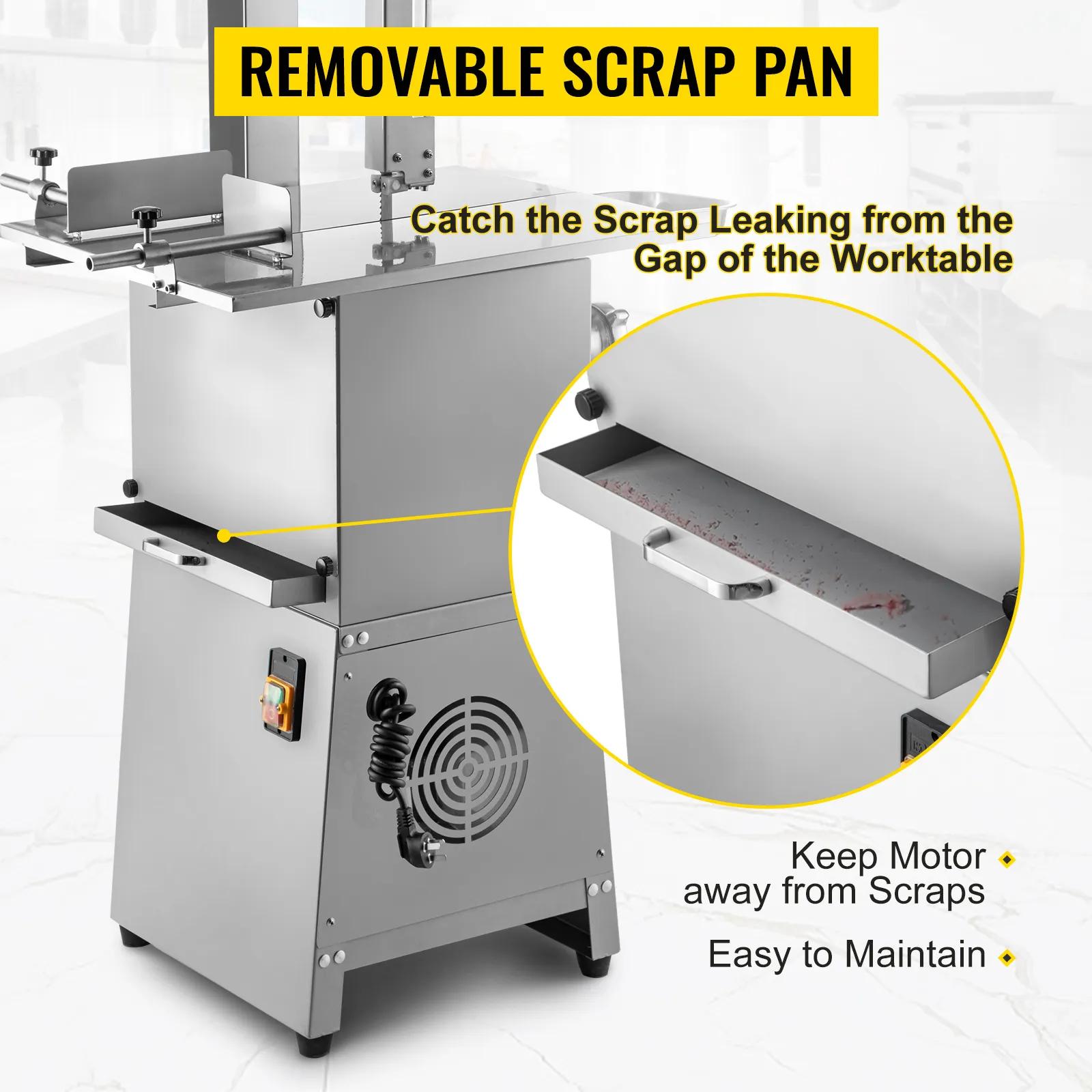 You can use this meat saw machine with various meats and bones without worrying about bone dust, thanks to the large lower scrap pan. It can easily catch bone crumbs, and it is also removable for ease of cleaning.